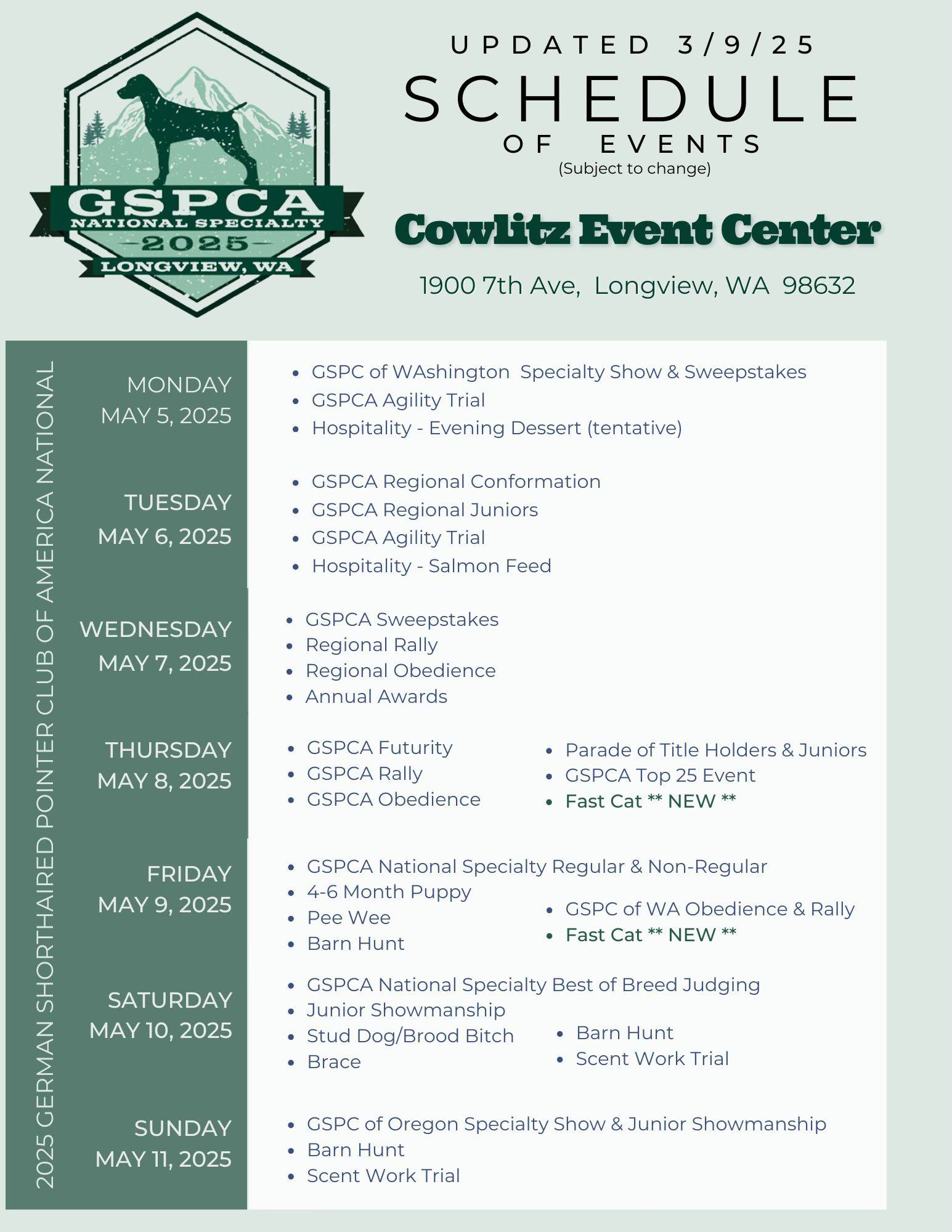 EVENT CENTER / MAPS JUDGING PROGRAM SCHEDULE HOTELS CAMPING AGILITY TRIAL TOP 25 &NOHS TOP 10 JUNIOR ACTIVITIES ⇓ CLOSES APRIL 30 ⇓ RINGSIDE CHAIRS [11] ⇓ CLOSED ⇓ TOP 25 DINNER RESERVATIONS ANNUAL AWARDSCELEBRATION DINNER TROPHY DONATIONS SHOW TROPHIES OBEDIENCE TROPHIES RALLY TROPHIES AKC JUDGESSEMINAR & WORKSHOP VENDORS CATALOG ADS COMBINED CATALOGS PARADESJuniors/Titleholders/Duals/Versatility SPECIALTY STORE SCHEDULE OF EVENTS SCHEDULE CURRENT AS OF 03-09-2025